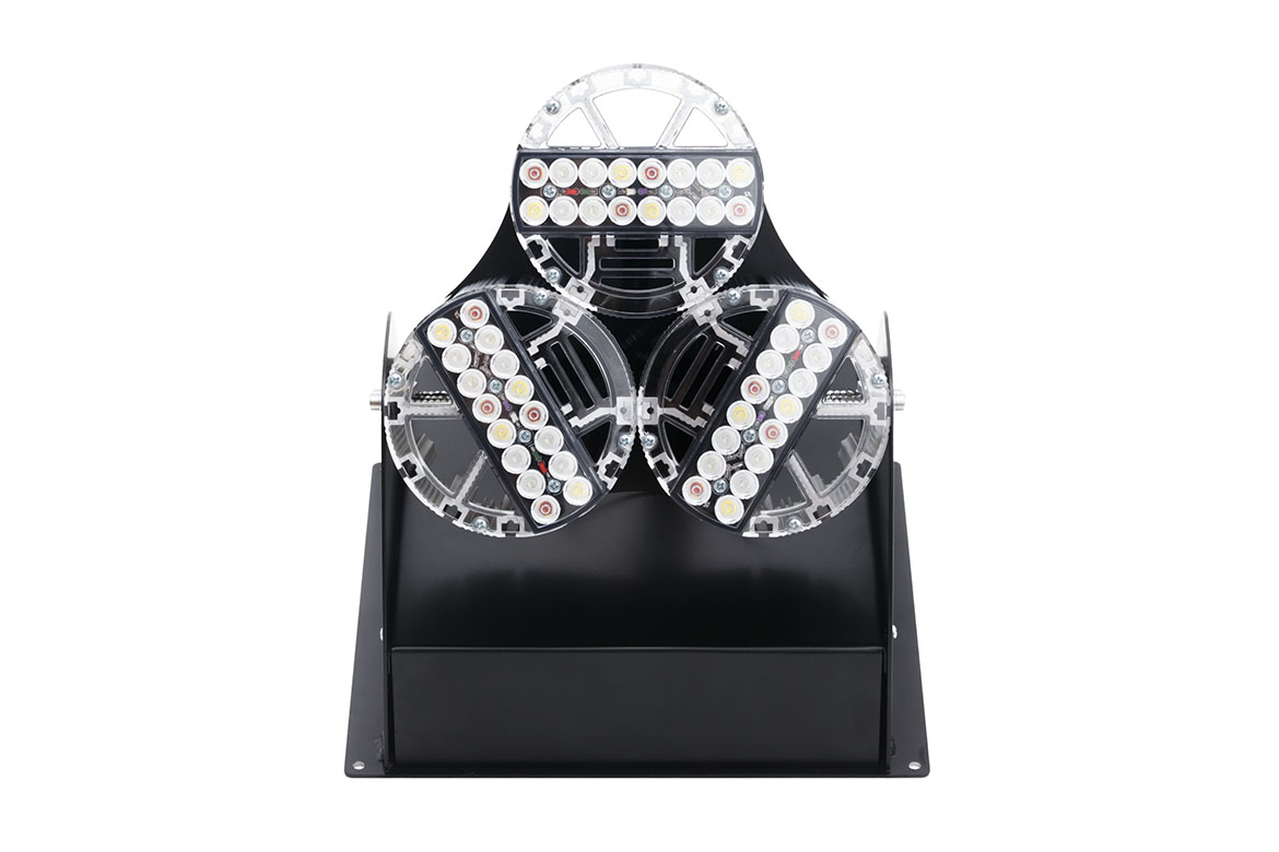 Прожектор с поворотным креплением для подсветки объектов, зданий и сооружений различного назначения мощностью 150 Вт — X-RAY DMX Lira 150 Л. Присутствие в названии модели буквы «Л» говорит о наличии вторичной оптики, что позволяет сформировать световое поле в соответствии с требуемой кривой силы света (КСС). В светильниках серии X-RAY DMX Lira 150 Л используются мощные светодиоды NICHIA 219 серии — по 16 светодиодов с общим световым потоком 6 000 Лм в каждом модуле. Потребляемая мощность одного модуля составляет 50 Вт.