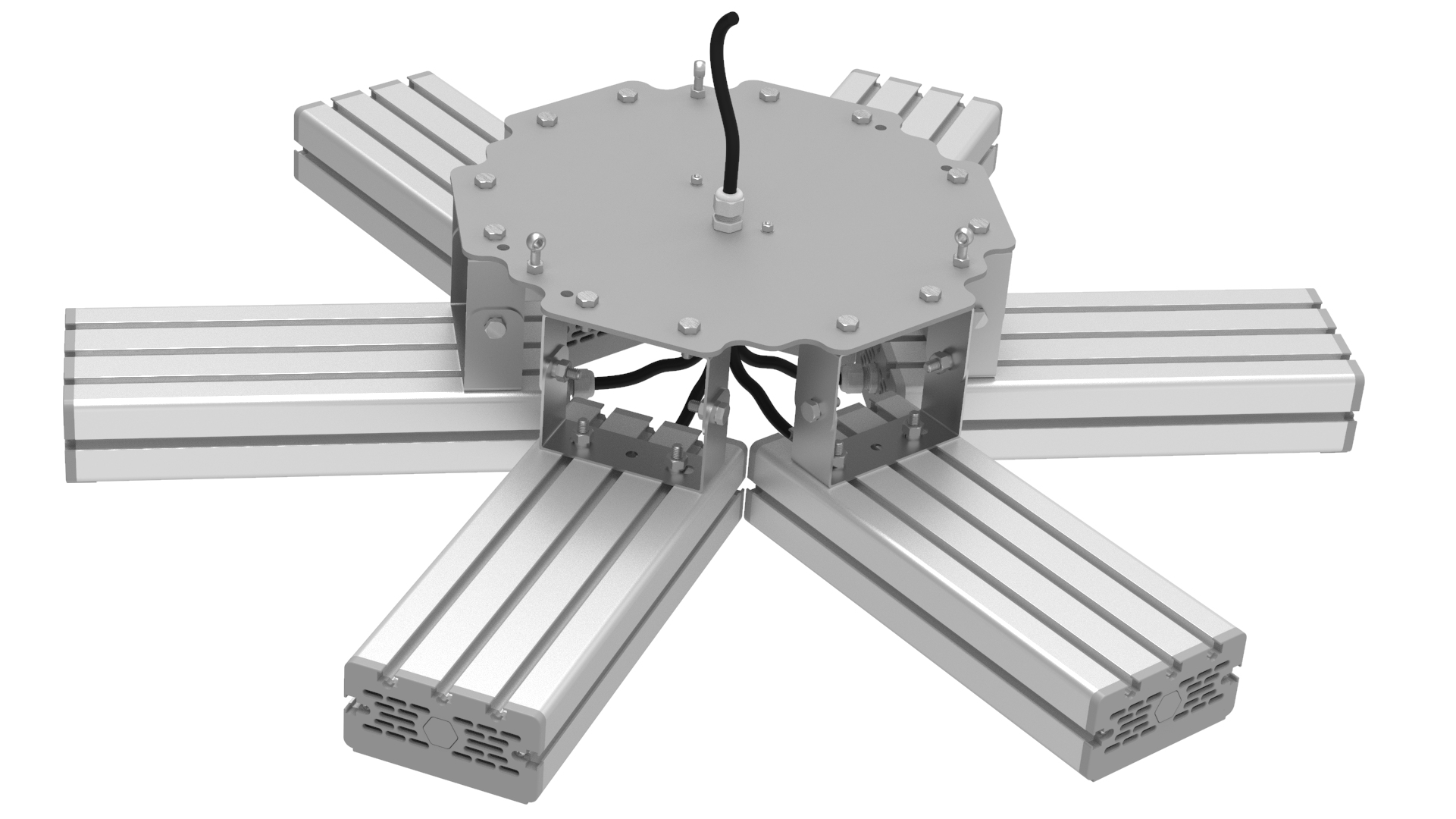 Подвесные промышленные светильники класса High-Bay с креплением на трос в 1 точке. Защита от 380В. Каждая секция имеет регулировку наклона.